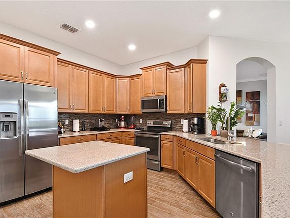 - Interior Features: High Ceiling(s), Master Bedroom Downstairs, Split Bedroom, Crown Molding, Walk-In Closet(s), Window Treatments, Unfurnished, Open Floorplan, Solid Surface Counters, Eating Space In Kitchen, Kitchen/Family Room Combo, In Wall Pest System