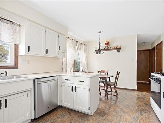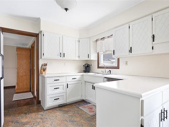 Upscale amenities are within your reach in this well appointed and budget pleasing ranch. Beautiful original oak hardwood floors and trim welcome your arrival with their timeless appeal. Crisp white cabinetry flanks the walls in abundance and forms a seating peninsula that rests between the kitchen and adjoining dining area. A pantry adds storage and cabinet pull-out features put all of your supplies within an easy reach. A fresh white finish on a classic mid-century modern built-in is the focal point of the generously sized living room. Dining room or second living area to accommodate your overflow of family and friends for the holidays. Board and batten style wainscoting rises from the floor and adds interest to the walls in the newly remodeled bathroom and tile surrounds the tub/shower. The basement is home to more living space and a private oasis owner suite. Owner bath with dual solid surface sinks, jetted tub, and glass enclosed tile shower. Two garages. Tree bordered lot.