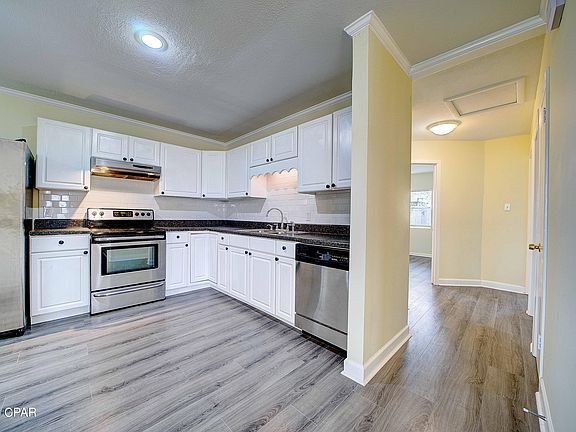 CURRENTLY UNDER CONTRACT, SELLER WILL CONSIDER BACKUP OFFERS || Beautifully remodeled 4 bed, 2 bath home in the heart of Lynn Haven! This home features many upgrades such as a brand new roof, new HVAC, new HWH, remodeled kitchen, LVP flooring throughout, and more. The living room is bright and spacious, leading to the kitchen. The kitchen is equipped with stainless appliances, white subway tile backsplash, plenty of cabinets for storage, and a dining area. This home features a split floorplan, offering plenty of peace and privacy. The primary bedroom is off the dining area and boasts LVP flooring, a private ensuite bathroom, and access to the backyard. The private primary bathroom features a shower/tub combo. The additional bedrooms also boast LVP flooring and share a full bathroom. The second bathroom features shiplap accents and a shower/tub combo with surround tile. The fenced backyard is spacious, featuring a deck and a concrete patio! The backyard is perfect for enjoying time outside with family and friends. This home is located in the highly desired Lynn Haven community. Lynn Haven features many parks including dog parks, splash pads, and waterfront parks with public boat ramps. This home is also located near schools, restaurants, shopping, and more! The community of Lynn Haven hosts many free seasonal activities including parades, festivals, farmers markets, and outdoor movie nights! Check out this home today!