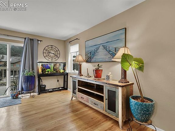 Nestled in the sought after University Park area in north central Colorado Springs, this spacious 3 bedroom, 3 bath townhome is immaculate and move-in ready, just waiting for your personal touches! This smaller complex in a highly desirable location has the best of all worlds - close to Union Meadows Open Space, Palmer Park, Austin Bluffs Open Space, University Village Shopping Center and many stores on Academy Boulevard, UCCS, restaurants, medical facilities, and easy access to I-25. But location is only the beginning... this versatile floor plan allows for a myriad of ways to use the space throughout. Entering on the main level, there is an easy flow into the large living/dining area with warm oak hardwood floors and gas fireplace. From the living area, look out onto the brand-new deck with serene views. The bright open-concept kitchen is just off the dining area and has recently refinished cabinets and hardware, high end countertops, and new dishwasher and built-in microwave. Upstairs, the two bedrooms have airy vaulted ceilings and lots of closet space along with a full bathroom. The finished walk-out basement with plenty of natural light is currently being used as a large family room with access out to the patio. Since there is also a closet and adjoining 3/4 bath, you might consider using the basement level as primary bedroom suite with two additional bedrooms on upper floor. The location of this particular end unit allows for so much privacy as it has a large grassy expanse on the side, with easy entrance and exit from the complex, and more fenced green area in the back. Imagine taking your large dog (no weight limit on pets) for a walk on the many nearby hike and bike trails and then come back and relax in air conditioned comfort, or grill on the deck, without worrying about yardwork! Adding to the comfort of this home is a one-car attached garage, as well as an additional designated parking spot in front of the house.