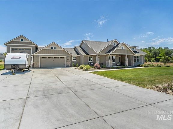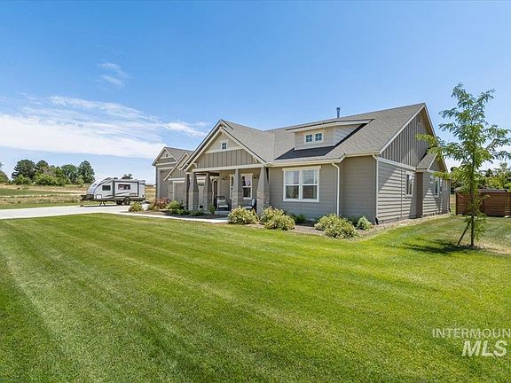 Upscale multi award-winning design by Pioneer Homes nestled on a sprawling 1.96 acres. Serenity abounds in this exquisite country community w/space for outbuildings, shop, & more. Fine craftsmanship & custom details radiate throughout. Gourmet kitchen boasts built-in stainless steel Bosch appliances, custom cabinetry, "hidden pantry" & open to the expansive great room w/ceiling accents & floor-to-ceiling stone wood-burning fireplace. Owner's retreat is light-infused & spacious, en-suite w/dual vanities, soaker tub, tiled walk-in shower & walk-in closet. With two beautiful spare bdrms, office/den w/separate exterior access, & gorgeous hardwood floors, this home truly packs it all offering the ultimate functionality & privacy. Back patio is covered w/an entrance to the dining area AND the owner's retreat. Plus a private hot tub area overlooking the backyard. Enjoy the fabulous over-sized garage to store all your toys w/brand new custom cabinets, epoxy floors & 14' RV bay w/10' pass-through rear overhead door.