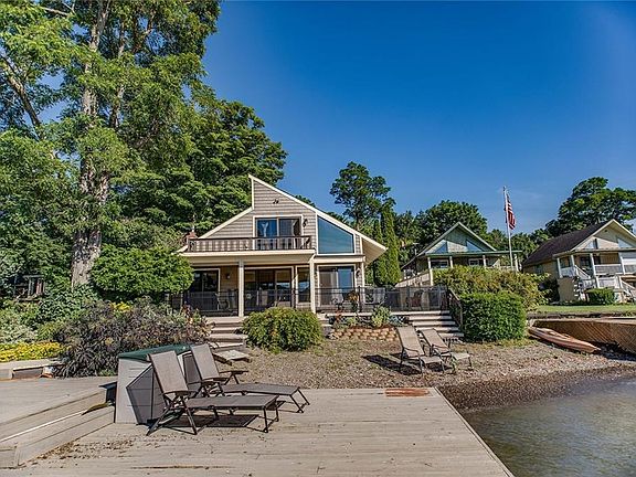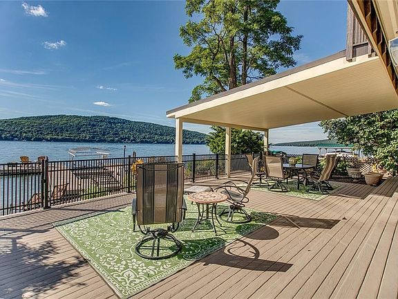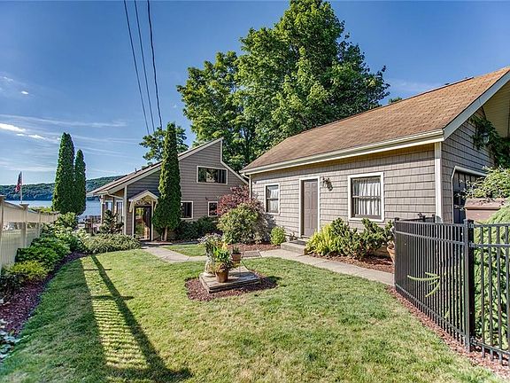 Ready to check off every item on your wish list? This year round home on the east side of Keuka Lake can do that! Walk in through the foyer to a large kitchen, open dining, and living area with gas fireplace. The lakeside of the home has a large sunroom with sliders to walk out to fabulous, oversized, covered deck on the water. The HUGE permanent dock and natural beach are spectacular. There is a first floor bedroom and half bath. Upstairs is another guest bedroom and full bath and a large master suite facing the water. The master has a walk-in closet, private bath and deck. Plenty of parking and storage with a two car detached garage and shed. Don't forget about the fenced in yard with lovely landscape. Your search for the perfect lake home ends here!