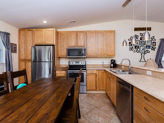 Enjoy the beautiful mountain views from the rocking chair front porch. Attractive interior design featuring hardwood floors, vaulted ceilings that creates an open atmosphere, Kitchen with plenty of oak cabinets, fronted by a custom serving breakfast bar and connected to the gathering space. Tile floors in the bathrooms and kitchen. Glass patio doors that leads to a comfortable 10 x 12 deck surrounded by mature trees. Alley access provides off street parking.