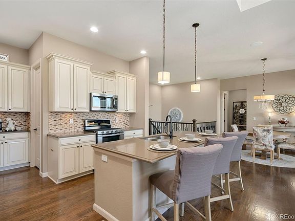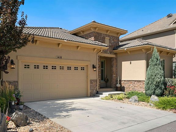 This Stunning Former Model Home has so much to offer, with custom designer finishes throughout! This ranch floor plan with a finished walk-out basement captures you the moment you walk in with its beautiful open floor plan, wood floors, tall ceilings, and numerous windows, filling the home with plenty of natural light. The large 3 panel sliding back door invites you to a large covered deck with an outdoor built-in gas fireplace perfect for sitting outside looking at the beautiful mountains and watching the sunsets. Fall in love with the kitchen offering raised-panel cabinets, corian countertops with an expanded island, SS appliances, gas cooktop, and a large walk-in pantry. Cozy up in the living room in front of the fireplace, or relax in front of the fireplace in the large flex room that can be used as a dining room, study, or project room. Stunning main floor primary suite with coffered ceilings and plantation shutters. Step into the luxurious primary bath with corian countertops, spa-like soaking tub, and large glass-enclosed shower. Find an additional 2nd bedroom, full bath, and laundry room on the main floor. The finished walk-out basement offers additional family and entertaining space, a third bedroom, and full bath. Entertain in the beautiful custom wine cellar and built-in bar area. The huge storage room offers plenty of room for those extra items. This home offers a great option for a lock and leave as the HOA maintains all the exterior landscaping and snow removal. Enjoy a round of golf at the Colorado National Golf Course, go for a swim in one of the pools, visit the fitness center and clubhouse, or enjoy the tennis courts, trails, and parks in the community. Close to shopping/restaurants and easy access to main Hwys.