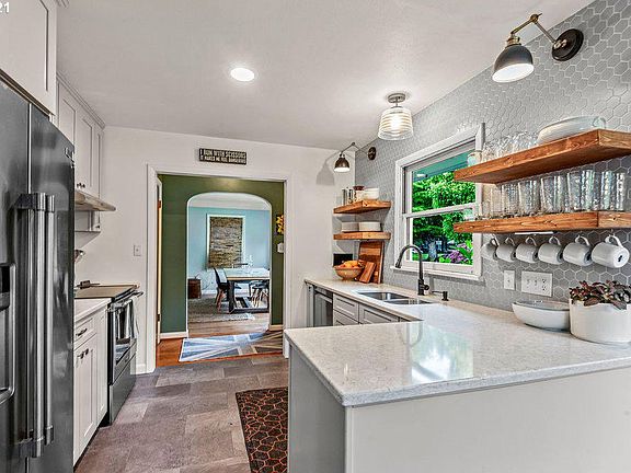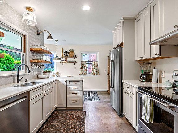 This early 50's 3 bed/1.75 bath in Longview's Old Westside boasts original hardwoods, coved ceilings, and restored wood windows. Tasteful remodel of main level offers lots of modern mid-century vibes. New kitchen w/quartz counters, tile backsplash/floors, open shelves, and custom nook. Finished (but dated) basement awaits your vision. New Roof, New Exterior Paint, New SS Appliances - Fully Landscaped, Generous fenced backyard w/ covered patio, and Paved front driveway leads to DRIVE-THRU garage!