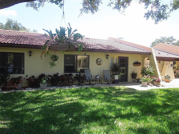 Welcome home to this lovingly maintained 2 Bedroom, 2 Bath spacious villa with new Luxury Vinyl Plank flooring throughout. Gorgeous end unit with fabulous curb appeal and surrounded by mature landscaping. Neutral coastal decor emanates throughout, with Vaulted ceiling in Living Room enhancing the natural light and showcasing two updated bathrooms with tiled walk-in shower in Master, and updated fixtures and lighting. Newer washer and dryer, and brand new microwave complete the kitchen. Sliders from the Master lead out to the huge screened lanai to enjoy the outdoor nature, and expanded brick patio for grilling or entertaining. Don't miss the added bonus of workbench and additional storage in closet behind the front door. Meet new friends at the vibrant clubhouse with a multitude of activities scheduled, expansive library, heated pool and tennis/pickleball courts. Great location close to GT Bray park, Blake Hospital, entertainment, dining and recreational activities, and of course only minutes from our sparkling Gulf Beaches. HOA fees include internet, cable tv, wifi, and sewer, trash & water! Hurry before it's gone! (Furnishings negotiable!)