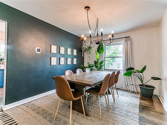 The interior is highlighted by dark, original hardwood floors and abundant natural light that creates a warm and inviting atmosphere. The dining room is generously sized, comfortably fitting an 8-person table, perfect for gatherings.