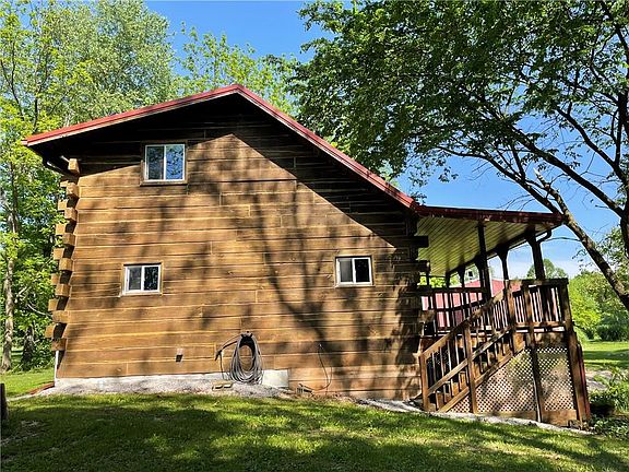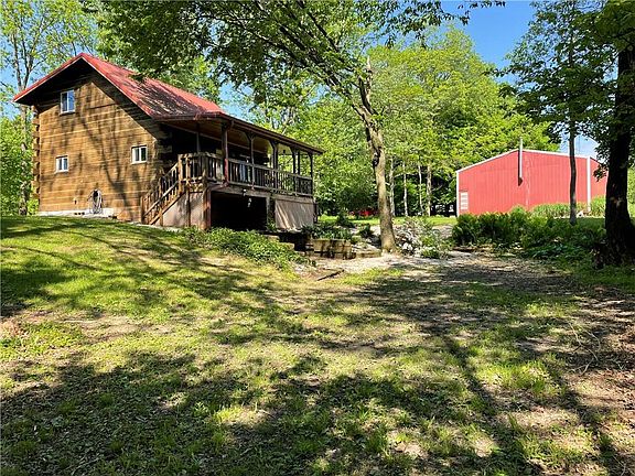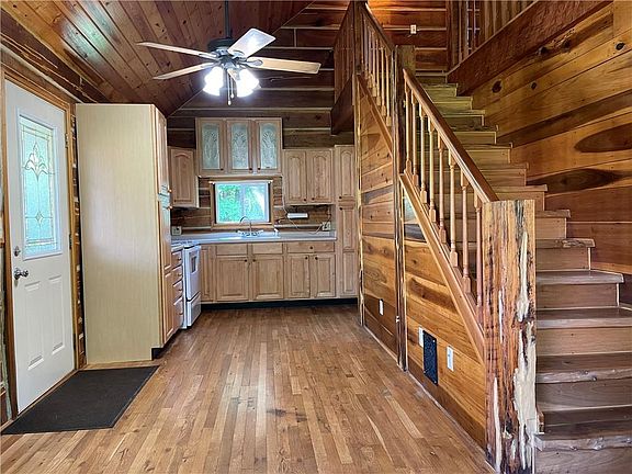 Solid built beautiful log home. This log home is absolutely adorable. Huge front covered porch overlooking mature landscaping/flower bed with peaceful water feature. Country kitchen/living room combo. Bedroom and laundry room/bathroom on the main floor. Upstairs is the master bedroom with precious 1/2 bath with a corner cabinet and unique light fixtures. Nice walk out basement with extra bedroom and family room area. Home is heated and cooled with electric wall units. Pole barn with huge sliding door, poured floor and electric. Very nice piece of property.