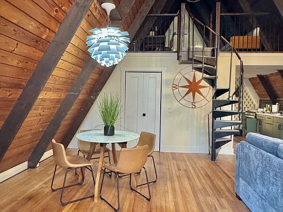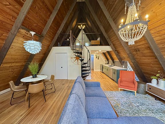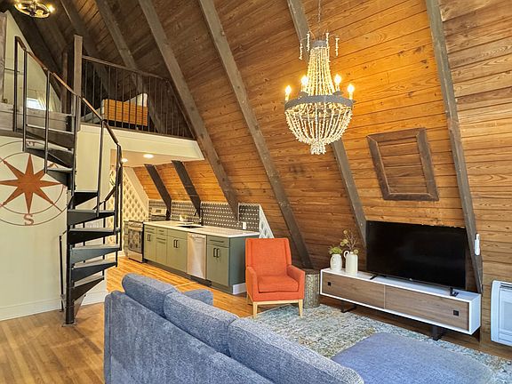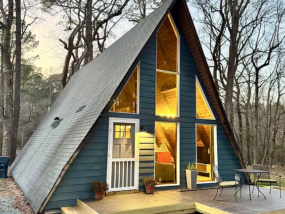 Fully Furnished (or unfurnished if you prefer) and a brand new remodel! This iconic A-frame was built in 1967 and has a rich history in Chatham County. The home features a bedroom on the first level with a king bed, large closet and dresser. A sliding glass door offers beautiful natural views and lots of light. The large open loft is accessible by the original (narrow) spiral staircase and features 2 twin beds, a couch, and a desk. It is complete with a clothing washer-dryer and dishwasher. This unique A-frame is situated on Manns Chapel Rd which does have road noise. The backyard/rear of the cabin is forested with a 2-acre pond and a family of ducks. Only 15 minutes from downtown Chapel Hill and Pittsboro. Amenities included: - Mini-split HVAC system for A/C and Heat - AT&T Fiber Hi-Speed Internet with Amazon Fire TV - Water - Blink Front Door Camera & Keyless Door Lock - Kitchen offers cookware, dishware, glassware, and utensils - Bedding and Linens - Driveway offers space for 2 vehicles - Weekly trash collection - Lawn Care and Pest Control *Note: Tenant pays for Electric (avg $175/mo) Lease terms are 6 to 12 months. Tenant pays for Electric (actual usage, avg $175/month) No Pets No Smoking Must have proof of 2- year consecutive and current employment, credit score of 690 or higher, and pass a criminal background check. Security Deposit equal to one month's rent Utilities included: AT&T Fiber Hi-Speed Internet, water, weekly trash service, pest control, and lawn maintenance.