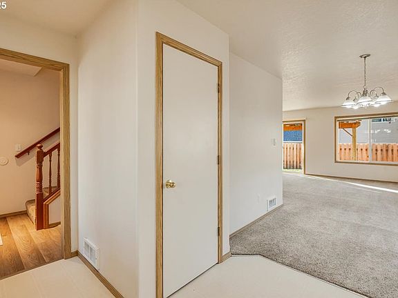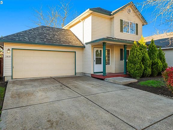Charming two-level home on quite dead-end street in north Newberg. Great room style living with very workable kitchen and loads of cabinets and pantry. All bedrooms located on the upper level sharing a spacious full bathroom with shower tub combo and plenty of countertop space. Primary bedroom has vaulted ceilings and walk in closet. Relax on the back patio where the backyard is fully fenced for your furry friends! Two car oversized attached garage with work bench. New roof 2024, fence 2022, Stove/range 2019, Cadet heater 2019 and paint, carpet 2017. Great location close to Jaquith park, schools and downtown Newberg. Open house Sat. 2/15 11-1 pm & Sun, 2/16 1-3 pm. Come take a look!