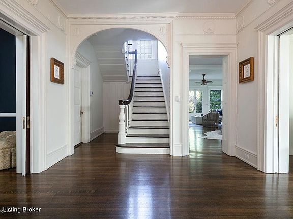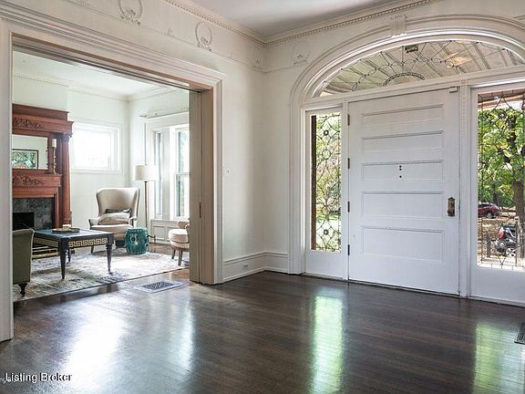 Welcome to the Queen of the Court! European-style Old Louisville beauty is a rare offering in the country's largest still-standing Victorian neighborhood. Exquisite details on the round, covered front porch offer the perfect spot for outdoor seating while being lulled by the famous Saint James Court fountain. Just inside, white-washed walls and elaborate original moldings combine with the owners' collection of modern art and present day furnishings to create an oasis for a new owner who craves the convenience of family functionality. To the left, a dining room with original stone fireplace is swathed in navy paint, and has large front window overlooking the beauty that is Saint James Court. To the right, a lovely and intimate parlor boasts the same views, along with pocket doors for added privacy and frosted glass on the windows. A soaring mantle here is eye-catching. A leaded glass door leads from the foyer into the home's living space. Built-in storage combines with a marble fireplace surround and gorgeous double rear doors that open to a private oasis of a rear yard. Overhead, a crystal light fixture bounces around the light entering from lead-glass windows on two sides. Easily accessible here is a first floor powder room, and a butler's pantry, adding the convenience of storage to this magnificent 120-year-old home. Though the butler's pantry blossoms the kitchen. Bright white, with plenty of prep and serving space, solid surface countertops, and a glass door that leads to the wisteria-covered patio. Just outside, the rear yard was once a fixture on the Old Louisville Hidden Gems Garden Tour, and is lovingly maintained with an updated irrigation system. Brick walkways, mature landscaping, and a sweet, winding path lead to the detached three-car garage. Back inside, up the entry staircase, with it's arched window and spiral balusters, we find the primary bedroom suite. Large enough for king-sized bedroom furniture and a sitting area, it opens to adjacent bath with stained glass window. A pocket door hides closet space. The second bedroom, currently used as a nursery, overlooks the color-changing trees just outside during Louisville's Fall. Via a large, walk-through closet, this bedroom has access to the hall bath, where some original fixtures mingle with updates of today. An office here has built-in bookcases and a closet of its own. Also here on the second floor, tucked near the rear stairwell, one will find a sunny laundry room, original built-in storage, and access to a private, second floor patio. The third floor finds two more bedrooms, one with exposed brick, and one with pitched ceilings and skylights, both sharing a loft area and a European-style split bath with marble floors. The current owners fell in love with the architecture and character here after a European getaway. Now the lucky new owners, too, can make their home in a piece of Old Louisville history. Southern Living Magazine just named Saint James and Belgravia Courts two of the South's Most Storied Streets. With the famous Saint James Court Art Show just outside during the first weekend in October, easy access to Interstate 65, downtown Louisville, and the University of Louisville campus, the accessibility of this neighborhood cannot be beat, and neither can the beauty of this wonderful Old Louisville mansion.
