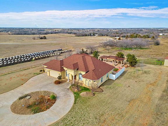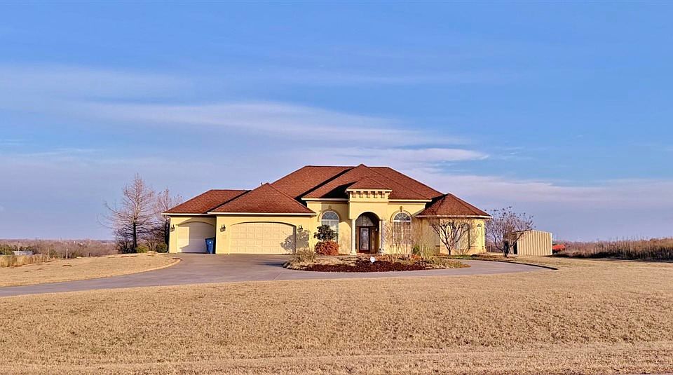 Absolutely stunning Mediterranean villa in the quaint country town of Marlow, OK is nestled on about 1.9 acres of land and offers just under 2700 sf of living space. Radiating with character and charm, 1419 W Caddo is a relaxing oasis where you can take refuge from the world. Fantastic curb appeal draws you past lush landscaping crested by a circle drive under a grand stone arch to enter this exquisite home where a stunning designer color palette and elegant details welcome you in. You will find 4 bedrooms plus study/office, 3 bathrooms, a 3 car garage and a beautiful inground pool. Upon entry, past a study/office and formal dining room this functional floor plan flows past a wet bar with sink and undermounted wine fridge to a gourmet kitchen where luxurious amenities abound to include a large island with vegetable sink, two color granite counters with tumbled stone Travertine backsplash, a gas gourmet cooktop and a refrigerator that stays while exquisite, custom built cabinetry with rope detailed trim highlight the space. Wow! Whether you’re a chef or just want to impress, this is the kitchen for you! Large picture windows and French glass doors overlook the outside kitchen and bar, the pool and pavilion with its own outdoor fireplace and the barn with rod iron fenced pasture beyond. Imagine, watching cattle and horses graze in the distance while you relax in your pool with built-in hot tub all the while living off the land: keep and raise chickens, horses, cows, sheep, goats etc. and harvest your new private orchard to make you self-sustaining. The possibilities are truly endless! The 3rd car garage offers an inground storm shelter to keep your family safe during inclement Oklahoma weather. Inside, the secluded master suite features a luxurious bathroom showcasing exquisite tile work, double sink granite vanity, beautiful frameless glass shower enclosure, walk-in closets and a luxurious Jacuzzi tub in the middle that is perfect for relaxing in after a long day at work! The floor coverings are wood effect tile and Travertine tile throughout and carpet in the primary bedroom. With all that this wonderful home has to offer, you would never have any reason to leave home but if you choose, you will be conveniently located close to Hwy 7 to Lawton, Duncan and OKC yet away from the hustle and bustle in a most serene setting where beauty and functionality meet timeless charm. Welcome Home! Please call or text Stefanie Johnson at 580 583 5238 for more information or to schedule a showing.