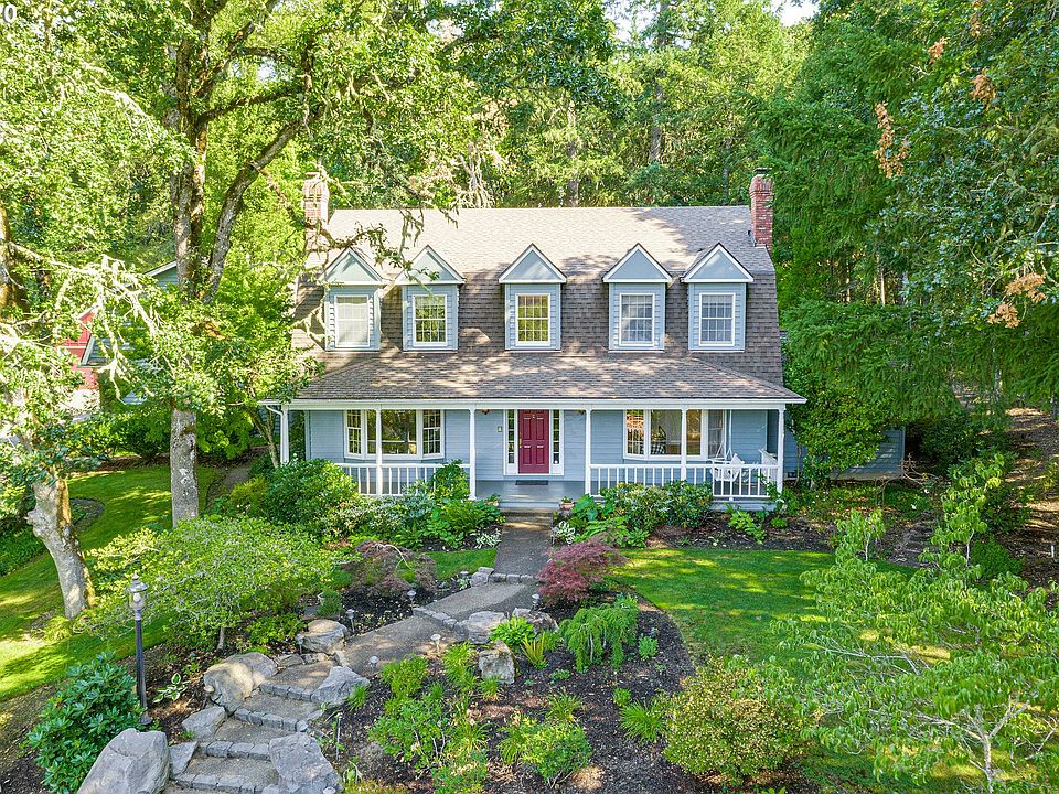The perfect pairing of 'Open Concept' & 'Traditional' this floor plan meets every preference. Country kitchen, breakfast area & family room are full of light with vaulted-exposed beamed ceilings opening to deck with private forested view and water feature. French doors lead to the formal living & dining rooms. Master Suite on the main has the 3rd fireplace, den/nursery & exterior door to private deck. 4 more bedrooms plus - Separate living/shop/orchard/pond/pool. V-TOUR HAS 3D & FEATURES LIST!