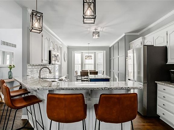 MOVE IN PERFECT with fresh décor, light fixtures, paint, and carpet. The main floor boasts the great room, gorgeous kitchen, dining area, an oversized bedroom, and full bath with shower. The stairwell highlights beautiful iron spindles and leads you upstairs and down. The eat-in kitchen showcases stainless steel appliances, abundant painted cabinetry, gleaming counters with undermount sink, full subway tile backsplash, tiered peninsula with bar seating illuminated by chic pendant lighting, an island, pantry, and dining area with lovely bay window. The upstairs includes a large loft/landing area perfect for so many uses. The beautiful homeowner's suite features a tray ceiling, his-and-hers closets, and an updated bath with double vanity, relaxing corner tub, separate tiled walk-in shower, and an entry into laundry room!! Also on the upper level is a full Jack-and-Jill bath shared with the 3rd and 4th bedrooms with private en-suite access from each, plus the laundry room is conveniently located on this bedroom level. The finished lower level features a family rec room, wet bar and half bath! There is also plenty of storage in this home. The fenced back yard with newly extended back patio is great for entertaining, and community amenities include a pool. The rare 3-car garage faces south for fast driveway melting in the winter. Located in the highly sought after Regency Place elementary school district and centrally located in JOCO with quick access to all your needs.