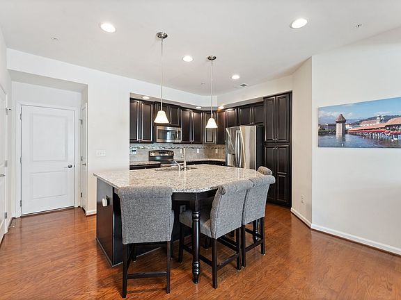 The oversized kitchen island serves as both a breakfast bar and dining area. The modern kitchen features granite countertops, stainless steel appliances, and plenty of cabinet space to meet all your storage needs.