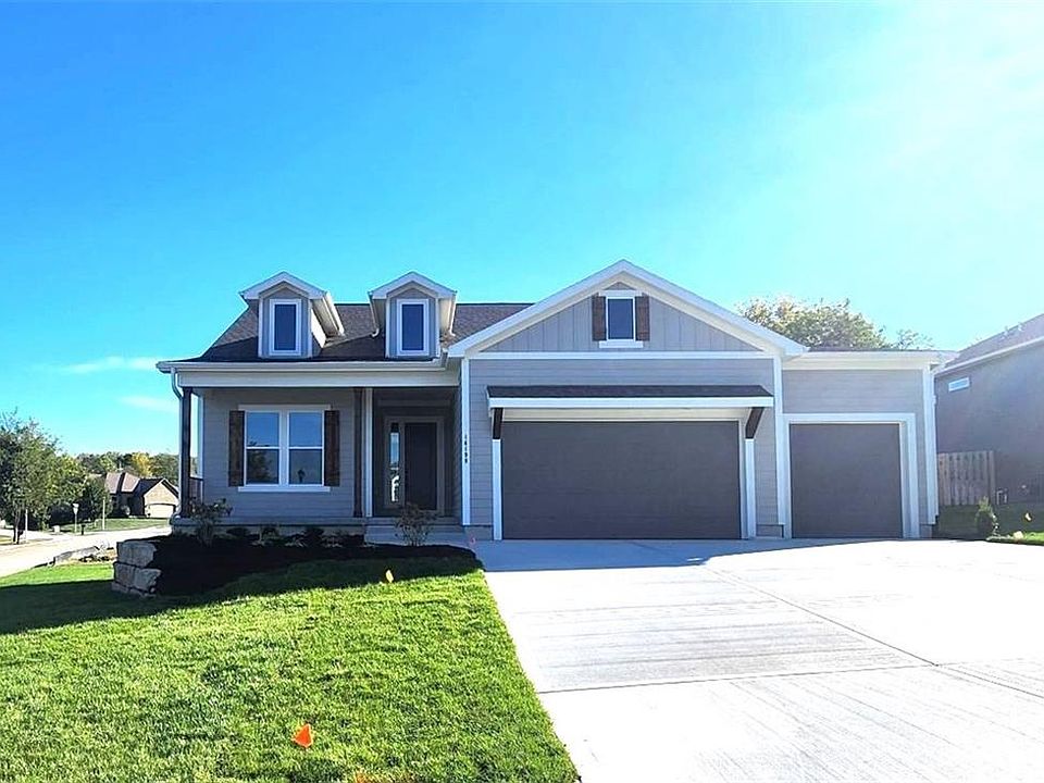 Don’t miss your chance to own this perfect blend of comfort, privacy and convenience! This charming reverse 1.5 residence is ideally positioned on a spacious corner lot in a quiet cul-de-sac — with no HOA fees! Once inside you'll experience thoughtful design and craftsmanship. The home is equipped with Low-E Pella windows, RevWood flooring, extra-deep garages, 8-foot garage and front doors, custom wood cabinetry, designer lighting, and tray ceilings with beams and accents. The great room is highlighted with a floor-to-ceiling stone-wrapped fireplace, and open-concept layout that flows seamlessly into a gourmet kitchen complete with a gas cooktop, built-in stainless-steel appliances, quartz countertops, and a massive walk-in pantry with electrical outlets. Additional luxury touches include a lower-level wet bar with beverage fridge, custom wood-trimmed wall accents, and direct laundry access from the primary closet—all designed with convenience in mind! Outdoor living is equally impressive with an expanded low-maintenance composite deck with stair access to a lower patio, ideal for relaxing or entertaining. In ground sprinkler system to help keep the fully sodded yard looking it's best. This home is in the award-winning Olathe School District and minutes from K-7 and I-35. It provides quick access to nearby groceries and convenient everyday shopping. Enjoy the great outdoors with nearby destinations like Lake Olathe, Nature Center , winery, and the scenic Cedar Niles Trail system. Schedule your private showing today! *Photos of actual home.