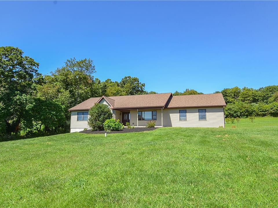 MULTIPLE OFFERS RECEIVED. Seller is calling for highest and best offers by Monday 9/11/23 at 5pm. Panoramic views in this sunning hilltop property! Perched at the top of a private, unpaved road surrounded by rolling hills, fields & mountains. This property includes 3 parcels of land totaling over 9 acres of private, picturesque land accompanied by fruit trees, & a mix of tree lined & cleared open space; a nature lovers paradise! This 2001 built ranch home was designed with an aesthetically pleasing open concept layout, vaulted ceilings, hardwood floors & magnificent views. You are welcomed by a Foyer entrance & living room with a high vaulted ceiling. The expansive kitchen & dining area are adorned with gleaming hardwood flooring, breakfast bar & French door to a rear paver patio. Primary bedroom boasts a walk-in closet & private bath complete with a Jacuzzi tub. Additionally, there are 2 more generously sized bedrooms, a full main bathroom & a convenient laundry room. Full basement provides endless opportunities!! This huge space offers a walk out to the rear yard, abundance of storage & potential for additional living space. Attic storage above the primary bedroom & the garage. Oversized two-car garage has plenty of space for your toys & storage! Provides access to the basement. Outside, adore the gorgeous park-like setting with serene sounds of nature all while still close to Pocono attractions such as Beltzville Lake, Blue Mountain Ski Resort, & Historic Jim Thorpe!