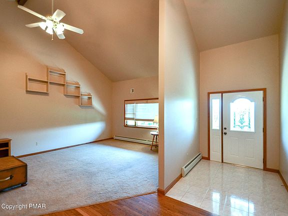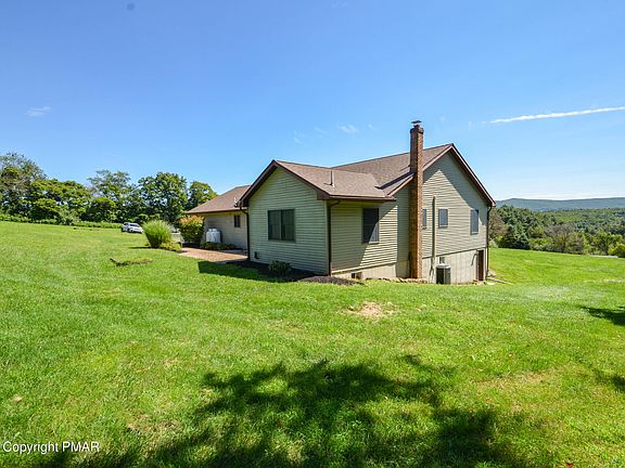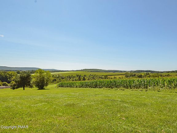 Panoramic views in this sunning hilltop property! Perched at the top of a private, unpaved road surrounded by rolling hills, fields & mountains. This property includes 3 parcels of land totaling over 9 acres of private, picturesque land accompanied by fruit trees, & a mix of tree lined & cleared open space; a nature lovers paradise! This 2001 built ranch home was designed with an aesthetically pleasing open concept layout, vaulted ceilings, hardwood floors & magnificent views. You are welcomed by a Foyer entrance & living room with a high vaulted ceiling. The expansive kitchen & dining area are adorned with gleaming hardwood flooring, breakfast bar & French door to a rear paver patio. The primary bedroom boasts a walk-in closet & private bath complete with a Jacuzzi tub. Additionally, there are 2 more generously sized bedrooms, a full main bathroom & a convenient laundry room. The full basement provides endless opportunities!! This huge space offers a walk out to the rear yard, abundance of storage & potential for additional living space. There is also attic storage above the primary bedroom & the garage. The oversized two-car garage has plenty of space for your toys & storage! It also provides access to the basement. Outside, you will adore the gorgeous park-like setting with serene sounds of nature all while still close to Pocono attractions such as Beltzville Lake, Blue Mountain Ski Resort, & Historic Jim Thorpe! Minutes from PA Turnpike & the new Lehigh Valley Hospital.