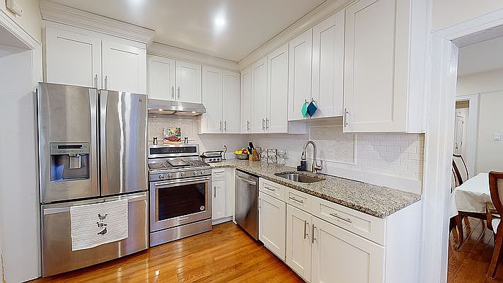 Looking for a 2 bed apartment in first floor private house with backyard, 2 car garage and on a quiet block Look no further the apartment features a newly renovated kitchen with granite countertops with stainless steel appliances dishwasher. Dining room that sits table of 6 comfortably. Separate living room. King size bedroom with lots of natural light and a queen size bedroom located at the opposite end of the house. Hot water included tenant is responsible for pay heat , cooking gas and electricity. can also come furnished