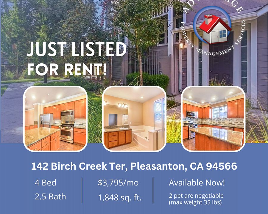 Schedule a Showing Online Come to see this exquisite tri-level 3 bedroom with office, 2.5 bathroom, 1,848 sq. ft. condo located less than a mile from downtown Pleasanton. The home opens into a staircase that leads you up to the living room and formal dining area featuring wood laminate flooring and a beautiful chandelier. Then you'll enter the open concept kitchen featuring stainless steel appliances, granite countertops and plenty of storage space. This floor also features a half bathroom. Upstairs on the 3rd floor you'll find three bedrooms and two bathrooms. The master suite features a beautiful bathroom with dual sinks, tub, and a walk-in shower. The 1st floor has a room that could be used as a bedroom or an office. The property is complete with a 2-car garage. We are looking for a long-term tenant who will take excellent care of the house. Available for move-in on ASAP Rent: $3,795.00/month Security Deposit ranges from $4,745.00 - $7,590.00 unless you qualify for our zero security deposit option provided by Obligo. Applicants that do not meet all the Basic Criteria, but exceed the Minimum Criteria, may be approved with a higher security deposit. If you join Obligo, you will not be required to pay a security deposit! Minimum Lease Term: 12 months Pet Policy: 2 pets with max weight of 35 lbs. are negotiable with a $500/pet security deposit increase and $30/month pet admin fee for the first pet and $20/month for additional pets. Applicants with pets are required to submit a pet application through a third-party pet screening service as part of our rental application process. Refrigerator: Included Washer/Dryer: Included Parking: 2-Car Garage Utilities Included: All utilities are Tenant responsibility Showings are available by appointment only. Schedule a showing online by clicking the Schedule a Showing link. The property is professionally managed by Advantage Property Management Services. Leasing Contact: Harrison Smith (DRE# 01902063) READ THIS IMPORTANT INFORMATION BEFORE YOU SCHEDULE A SHOWING There is a $50/adult non-refundable application fee and ALL adults residing in the property must apply. We will (1) verify your identification; (2) check your credit report, unless you receive a Government Rent Subsidy and request to provide verifiable alternative evidence instead of a credit report no later than when the application is submitted; (3) verify your household income and employment, if applicable; and (4) verify your rental history with previous landlords. Most applications are processed in 2-3 business days from the date we receive a completed application and all supporting documentation. Security Deposits are calculated using a risk-based model. Applicants who meet all the Basic Criteria may be approved at the advertised security deposit amount. Applicants who do not meet the Basic Criteria but exceed the Minimum Criteria may be approved with a higher security deposit, not to exceed the legal maximum. We offer a security deposit-free option for qualified tenants using Obligo billing authorization technology. Security Deposits for active-duty military and properties subject to AB12 cannot exceed 1x the rent. Prior to move-in, proof of a current renters insurance policy with APMS listed as an Additional Interest and coverage of at least $300,000 for personal liability must be provided. Please DO NOT APPLY if your credit score is below 650, your household income is less than 2.5x the asking rent, you have ever been evicted, you have negative rental history, or your pets do not comply with this property's pet policy. If you have a Government Rent Subsidy and elect to provide verifiable alternative evidence of your reasonable ability to pay rent instead of a credit report, you must inform APMS when you submit a rental application. Failure to notify us at this time may disqualify you from participation in alternative verification. We will provide a list of required documentation after we receive a request. All documentation must be provided within 48-hours. Contact us to learn more about this process and the required documentation. All verifiable sources of income will be considered. Pursuant to CA Gov. Code 12955(o), the income multiple is based on the amount of rent that will be paid by the Applicant (not the total rent amount) if the Applicant has a rental voucher or other housing subsidy. To help ensure all residents understand our animal policies, all Applicants must submit an animal application at https apms. All Information Deemed Reliable But Not Guaranteed. APMS is not responsible for content published by third-party listing websites (i.e. Zillow, Trulia, Hotpads, etc). Central Heat/Air Disposal Pets Allowed Refrigerator Included Washer/Dryer Provided