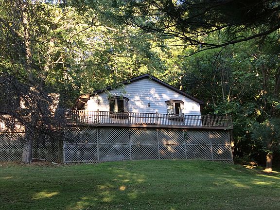 Quiet secluded ranch set back off the road with loads of privacy. Meandering tree lined drive. All rooms lead to private sitting areas and a built in stone BBQ completes the outside entertaining area. Beautiful stone fireplace in living room with built-ins and beamed ceiling. Additional large room awaiting your imagination and personal touch. Spacious 19x18 garage. Generator hook up & Central Air. All wrapped up in beautiful vinyl shake siding. Make this house your home! Perfect weekend getaway or year round home.