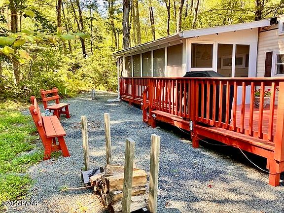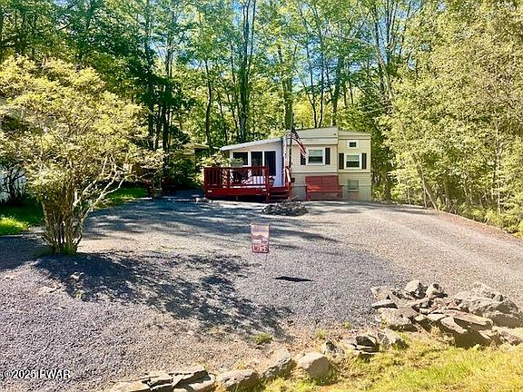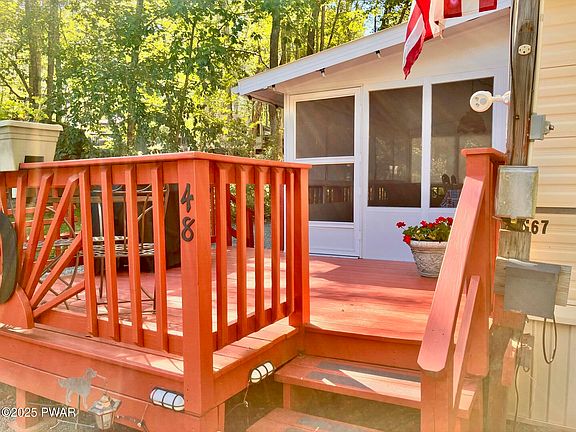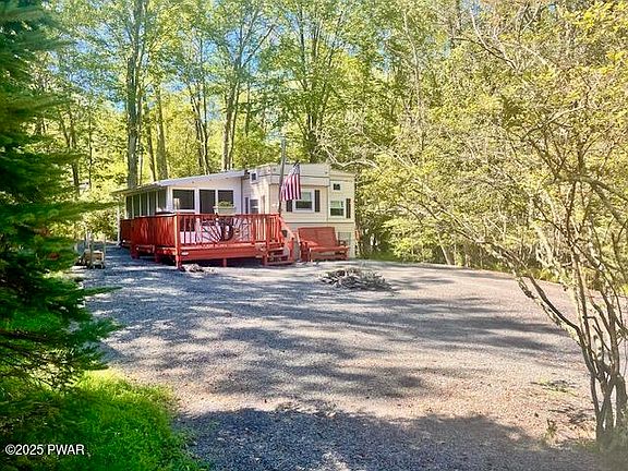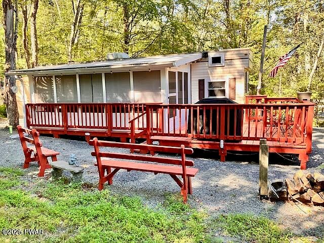 Large Park model rv with 2 bedrooms. One large primary bedroom and large bunkroom featuring 4 bunks!! Flat, stoned out lot with a hardtop screen room leave nothing to be done except enjoy the property. Located in an amenity filled community in the heart if the Poconos. just a short drive to local amenities including the town of Milford, the Delaware river, local waterfalls, hiking trails and more. enjoy all the amenities within the community including, the pool, the lake, beach, clubhouse, mini golf, 24/7/365 secutiry, water, electric and sewer!!