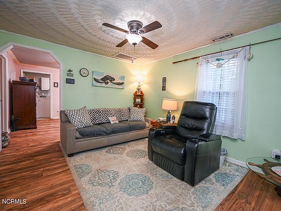 Welcome Home to this cute bungalow on a HUGE lot in Moyock! Situated on right at 1.4 acres, this gem offers room to spread out in a quiet and wooded setting. Plentiful parking leads you to large covered porch. Enter into the generously sized front great room. This room among others boast newer LVP floors. Leads into the large dining area that is open to the spacious kitchen. Island is great for prep work and seating and has dishwasher! Washer and dryer off kitchen as well as full bathroom. Two large bedrooms make living a breeze! Off kitchen is back deck for your morning coffee. Enjoy the simple life of country living in this Home today!
