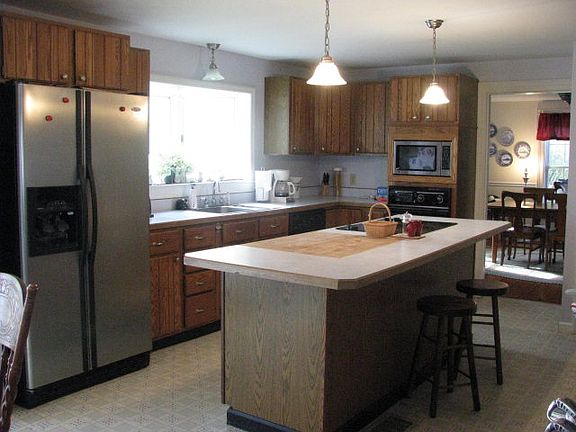 PERU Spacious attractive farmhouse with large open kitchen to the great room with cathedral ceiling and a wood burning fireplace. There are 4-5 bedrooms. The current family room cold be converted back to the first floor master/in-law suite. Nice private backyard surrounded by apple trees.
