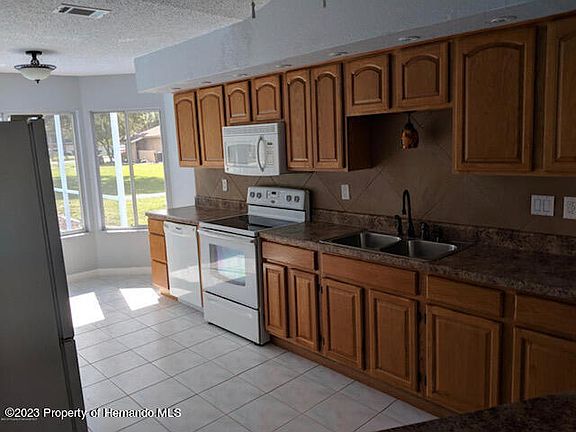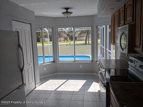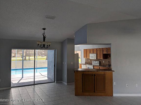 Experience the true Florida lifestyle in this lovely 3-bedroom, 2-bathroom home with a beautiful pool and a charming white vinyl-fenced yard. The house is designed with a split bedroom layout, ensuring your privacy and peace. The open great room with cathedral ceilings and kitchen nook provides a warm and welcoming atmosphere for your daily life. The kitchen comes with wood cabinets and is a perfect space for your culinary adventures. Updated bathrooms and convenient indoor laundry make everyday living more comfortable, and the circular driveway adds to the home's curb appeal. This home is conveniently located near hospitals, shops, and dining options, with easy access to the Sun Coast/Veteran's Highway for an effortless daily commute. Plus, it's just a stone's throw away from the famous Weeki Wachee State Park, stunning beaches, top-notch golf courses, and the excitement of Busch Gardens. You'll also be close to the rich cultural scene of Tampa and St. Petersburg, offering endless entertainment options. Don't miss out, make it yours today!