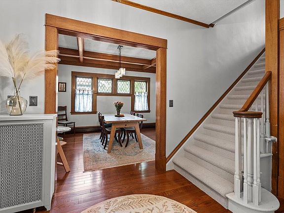 This thoughtfully maintained 4-bedroom, 2-bath home offers an inviting blend of historic character and modern upgrades in a sought-after Rockford location. Classic details like original woodwork, coffered ceilings, and built-ins are complemented by a refreshed kitchen featuring quartz countertops and stainless steel appliances, along with new flooring and custom window treatments throughout. Recent improvements include an updated electrical panel and a high-efficiency mini split A/C system, enhancing both comfort and efficiency. Enjoy the light-filled sun porch, generous living spaces, and timeless architectural charm. Situated on a landscaped corner lot, the property includes a detached 2-stall garage, a new cedar privacy fence, and easy access to nearby parks, trails, shops, and dining. A rare opportunity that combines classic style with modern convenience.