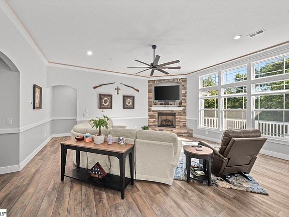 Welcome to this one level 3 bedroom 2 bath home on 1 acre in a gated community! BUILT IN 2022 you will find a perfect blend of modern convenience with the serenity of beautiful landscape which features a calming waterfall and fire pit area with your choice of viewing it all from the massive partially covered deck above or the partially covered patio below! The home features an open concept living space where natural light pours through the large windows highlighting the home's contemporary design and elegant finishes. The spacious kitchen with farmhouse sink, large center island and walk-in pantry connects to the great room with a gas fireplace. The sunroom is the perfect place for conversation or enjoying some quiet time and it’s where you can access the deck to head out to the backyard! Back inside, the office/flex room provides an ideal spot for working from home, hobby or exercise room. The primary suite is a private retreat with a luxurious walk in shower and direct access to the covered deck. With a split room concept the two additional bedrooms are on the opposite side of the home. The lush, manicured yard is a haven for outdoor enthusiasts and provides plenty of space for activities and gardening plus it backs up to 5 wooded acres of common space - no neighbors behind! With its proximity to downtown Travelers Rest and the Swamp Rabbit Trail, you’ll enjoy the best of both worlds: a peaceful retreat with easy access to urban amenities and outdoor adventures.