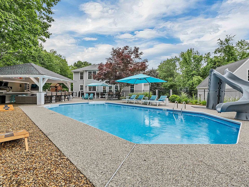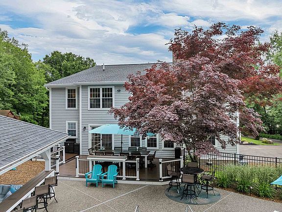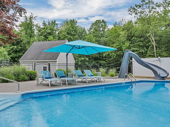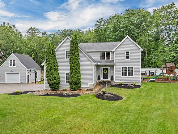 Welcome to 142 Flint Road in picturesque Candia, NH! Nestled on 11 private acres next to Candia Woods Golf Course, this exceptional 4-bedroom, 2.5-bath home offers the perfect blend of elegance, comfort, and outdoor recreation. Step inside to a recently updated kitchen with modern finishes, which opens seamlessly into a sunlit dining area, a spacious family room, and a dramatic two-story sitting room featuring a stunning fieldstone fireplace with pellet stove. Expansive windows throughout the home bathe the living spaces in natural light. Outside, your private retreat awaits. A large composite deck overlooks a sparkling, heated saltwater inground pool, complete with a huge covered patio and pool house—perfect for summer entertaining. Car enthusiasts and hobbyists will appreciate the attached garage and the separate two-car garage with finished space above, ideal for a workshop, studio, or workout area. Surrounded by scenic trails and just minutes to Route 101, this property offers serene seclusion with convenient access. Whether you're relaxing poolside, exploring the Candia Town Forest, or playing a round of golf next door, this home promises a lifestyle of luxury and tranquility. This home is a rare find in Candia! Don’t miss the opportunity to make this extraordinary property your own. Open house Thursday 7/10 5 - 630pm & Sat 10 - noon.