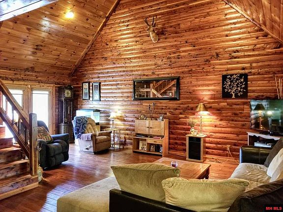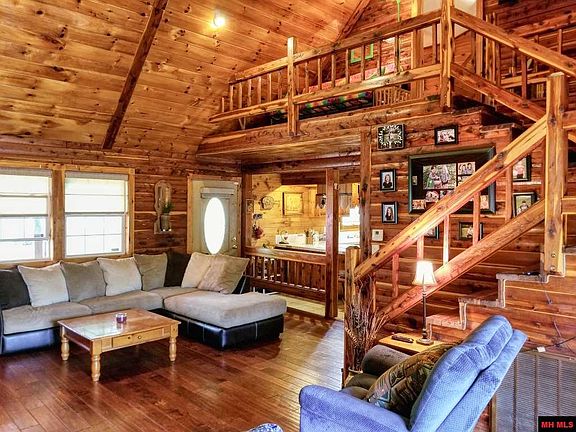 2 bed/2 bath cabin nestled on over 10 acres m/l with stocked pond and outbuildings. Cabin offers cathedral ceilings, walk-in closet in master, large pantry, new deck on back of home, newly stained front porch, workshop/man cave in garage, outbuilding with electricity, custom blinds, new roof on gazebo, 2 septic tanks, RV parking, all on a park like setting! 10 minutes to town, CR is paved-only driveway is not.