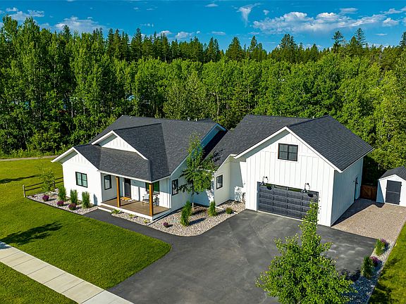 Immaculate one-owner home with 4 bedrooms and 3 bathrooms plus an oversized bonus room that could serve as a 5th bedroom. This 2522 SF modern farmhouse style home sits on an oversized lot, adjacent to a park and backs up to greenbelt of lush trees creating perfect privacy. The home is located in a quiet, friendly, and walkable neighborhood, and since it was built in 2018 has been impeccably maintained. Enjoy a spacious, open concept floorplan with modern finishes. Stainless steel appliances, covered front porch and back patio, spacious laundry/mud room, oversized garage, large storage shed, and RV/boat parking are just a few great features....and the school bus stop is steps away! With great proximity to schools, downtown, hospital, ski resort, Kalispell’s northern conveniences and Glacier Park make this the perfect location!