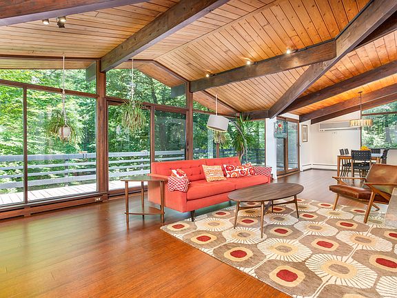 Welcome home to this stylish Deck House with signature decking ceilings and hallmark post and beam construction allowing for open spaces and expansive windows that create amazing views! This private 2.7 acre property is tucked right up against State Forest with miles of hiking trails right out your front door. The home immerses you in nature as its wall of windows leads out to the expansive deck perched over your own private pond. The over 3000 sqft, no compromises interior features bamboo floors, modern remodeled baths, an open dining-living area, 2 fireplaces, 5 bedrooms, and plenty of flex spaces for exercise room, rec room, and office. This serene retreat offers incredible privacy while only minutes from Downtown Simsbury, 30 minutes from Downtown Hartford, and roughly 2 hours to both New York City and Boston. Simsbury, CT is recognized as a bicycle friendly community with quaint New England charm, award winning schools, and cited as one of the best places to live in Connecicut, New England, and Nationwide! Be sure to see the HD property video, HD photography, and Interactive 3D Virtual Tour! Schedule your virtual or in-person showing today.