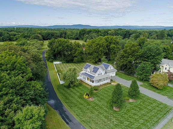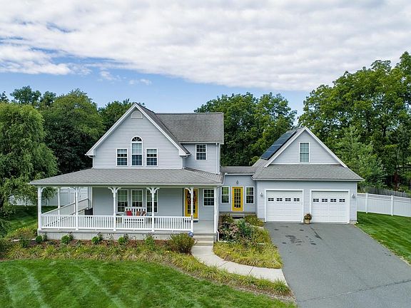 A rare find...well maintained newer construction, within walking distance to downtown dining & entertainment, and a short drive to area highways! This beautiful home is set comfortably back from the road on a .91 acre lot with a stunning view of Mt. Tom! Enjoy the seasons from the 10' X 50' wrap-around farmer's front porch, or from the rear patio overlooking the fenced rear yard. The 2-car garage is conveniently connected with a 3-season mud room/ sitting room, with slider to the back. Inside you'll find a bright, spacious living area with gleaming hardwood floors and 9' ceilings. Open dining area with french doors to the porch, master en-suite, and 1/2 bath with laundry round out the first floor. The second floor has 2 large bedrooms and a full bath. The entire basement is insulated and has workshop and additional living area, with a ductless mini-split for HVAC. The finished area (approx. 312 sf) is perfect as home office, or family room. REDUCED ELECTRIC COSTS- leased solar panels!