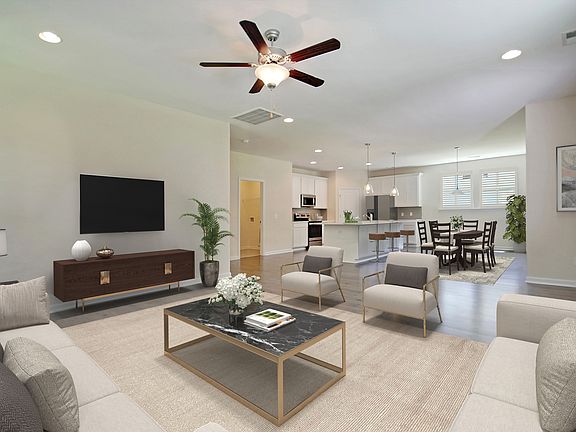 A front porch greets guests as they enter the full foyer - a feature that is hard to find with many new construction homes today. A flex room can be turned into a downstairs bedroom with full bath, perfect for a mother-in-law suite or guests who don't want to bother with stairs. This flex room could also be used as an office, playroom, media room, or even separate dining room with a double window. An open kitchen with oversized island and corner walk-in pantry looks out to the breakfast area and huge family room with optional fireplace. The master bedroom overlooks the backyard and boasts an extra long walk-in closet, dual vanity sink, water closet, and linen closet. Upstairs, two bedrooms share a full bath, and a centrally located loft offers a private retreat that feels far removed from the downstairs.