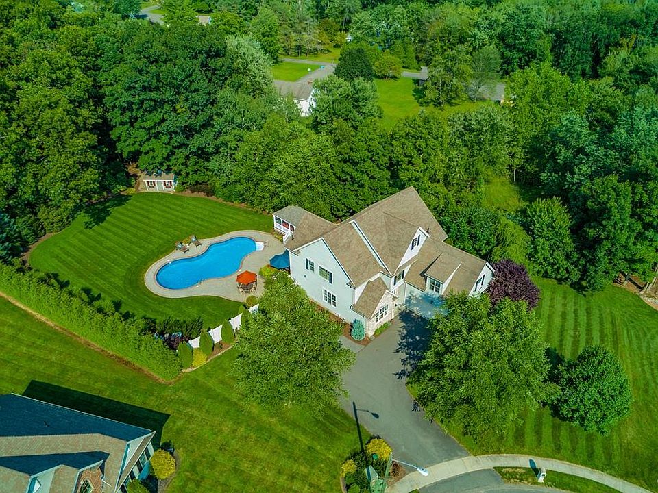 Absolutely stunning Colonial located at the end of a cul de sac with its very own private oasis! Featuring a beautiful sun filled kitchen with granite counters, island, stainless steel appliances and an eat in dining area. Beautiful 2 story family room with hardwood floors and fireplace. Lovely dining room with custom molding open to living room. First floor bedroom and full bath. Second floor offers 3 generous size bedrooms, master bathroom features hot tub, separate shower, double vanity and large walk in closet with built in shelving. Finished basement with game room, bedroom & full bath. Custom window treatments will remain. Very impressive home! Exterior has an inground heated salt water pool with solar blanket, cabana w/electricity, hot tub, trex decking and is completely fenced in. A true private paradise. Don't miss out!