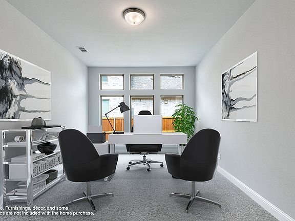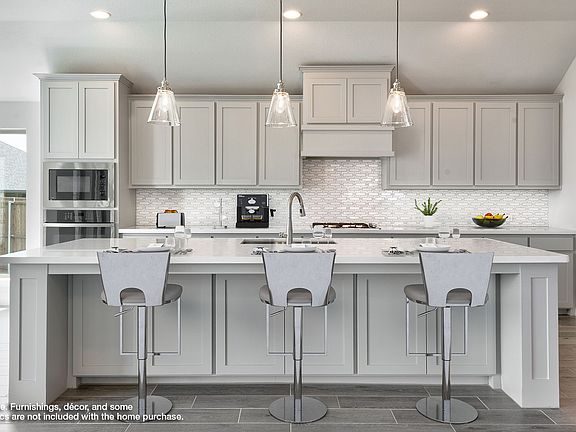 Extended entry leads to open family room, kitchen and dining area. Family room features a wood mantel fireplace and wall of windows. Kitchen hosts island with built-in seating space and 5-burner gas cooktop. Game room with French doors just off family room. Secluded primary suite. Dual vanities, freestanding tub, separate glass-enclosed shower and two large walk-in closets in primary bath. A Hollywood bath, high ceilings, large windows and abundant closet space add to this one-story design. Extended covered backyard patio. Mud room off three-car garage. Representative Images. Features and specifications may vary by community.