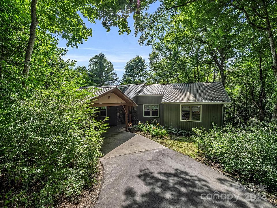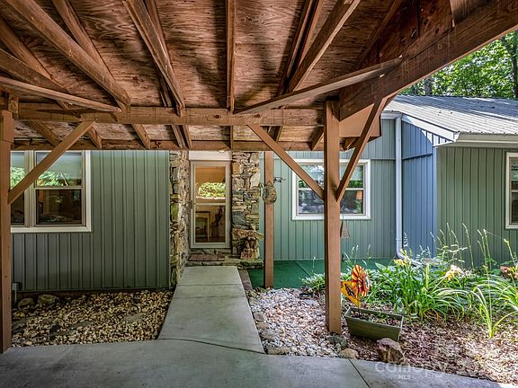 142 Mine Mountain Drive is a charming home nestled in the serene wooded setting of Pisgah Forest, NC. This delightful property offers convenient access to Pisgah National Forest and the vibrant town of Brevard, NC. The circle driveway leads through a covered carport, providing easy parking and protection from the elements. Step inside to be greeted by a great room with soaring ceilings and clerestory windows that flood the space with natural light. The kitchen connects to the dining area on one side and on the other you'll find a cozy den featuring a stunning rock fireplace, perfect for relaxing evenings. The primary suite is located on the southern end of the home, offering a spacious bedroom and generous closet space. Two additional bedrooms and another bathroom can be found on the opposite end of the house. A lovely screen porch overlooks the fenced back yard. This home is a perfect blend of comfort and convenience, surrounded by nature's beauty.