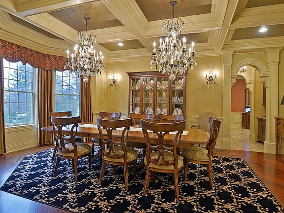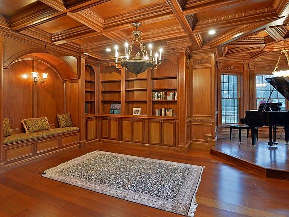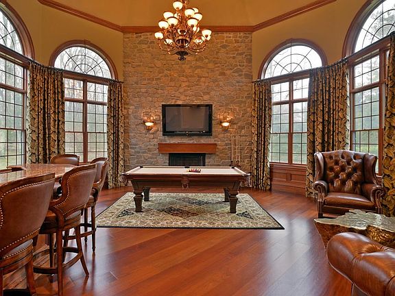 Palatial estate w/many opulent amenities. 13ft mahogany/iron entry to 2-story foyer w/suspended staircase. 2-story FR w/gas fplce & pallad windows. LR w/rich wood paneling, carved coffered ceilings & rotunda. Oversized chef's kitch w/all prof applcs, incl Subzero fridge & freez, fridge drawers, huge island seats 4, Thermador range/wall oven/bread warmer, built-in Miele coffee maker. Large dinette w/slider to covered stone patio w/cook center. GR & Conservatory w/gas fplces, ideal for entertaining. 2nd caterer's kitch on 1st floor. MBR has large dressing rm & French drs to balcony. MBath w/2 sinks, jet tub & large glass shower. 4 more bdrms on 2nd fl - 3 w/ensuite baths & big closets. Wide plank wood floors throughout. Fin walk-out bsmt w/theater, exercise rm, play rm, large bar, & huge