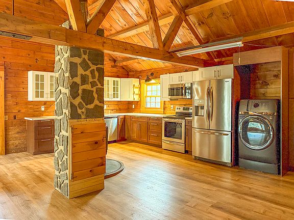 Discover this quintessential log cabin home, privately set back from the road on nearly 20 acres of versatile wooded land. Blending rustic charm with modern conveniences, this property offers endless possibilities for those seeking a peaceful rural Maine lifestyle. Located just 5 miles along main roads from downtown Belfast and the coast, you wind up a dirt driveway to arrive in another world. You'll be welcomed by a covered entryway into the home and drawn into the inviting open-concept living space. Centered around a striking stone fireplace, the great room boasts vaulted ceilings and warm wood floors throughout. The recently renovated kitchen is equipped with everything you need for modern cabin living, while the covered porch spanning the width of the house provides the perfect spot to enjoy the outdoors in any weather. The first floor also includes two pleasant bedrooms and a full bathroom. In the upstairs loft is the third bedroom with a balcony overlooking the great room. The property's history nods to the days when Waldo was home to bustling sawmills that supported Belfast's shipbuilding legacy. Check out the light fixture made out of an old saw blade! The grounds feature a level sunlit field just behind the house, several spacious barns, a small unfinished guest cottage, various outbuildings (some usable and others good for salvageable materials perhaps), as well as plenty of woods to explore. For even more access to nature, you're in easy walking distance to a Hills-to-Sea Trailhead to jump on the scenic 47 mile footpath connecting Belfast and Unity (home of MOFGA). Whether you're dreaming of a year-round Maine getaway, or starting a farm or a home-based business, this property delivers endless potential. Come explore the possibilities!