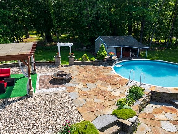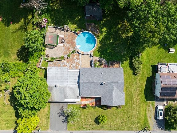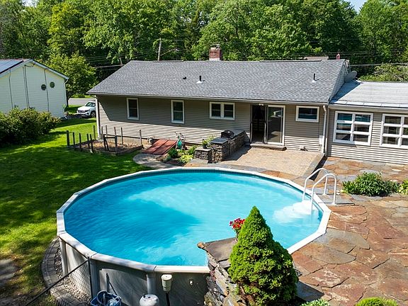 Welcome to this beautifully maintained 4-bedroom, 2.5-bath ranch w/ 2-car garage featuring a versatile layout, perfect for multi-generational living or hosting guests. The main living area boasts a spacious eat-in kitchen and a large living room w/ hardwood floors and a cozy gas fireplace. 3 bedrooms, all with hardwood flooring, and a full bath complete the main level. The attached in-law apartment offers a private retreat with its own eat-in kitchen, a large bedroom, and an updated bathroom with a modern tiled shower. Enjoy the recently renovated sunroom with new laminate flooring, and head downstairs to a partially finished basement that includes a large family room with bar area and an additional 1/2 bath. Step outside to your personal oasis featuring a stunning stone patio, cabana, and an above-ground pool with a waterfall feature! A dedicated garden area and storage shed complete the outdoor space. Other recent updates include newer roof and boiler. Schedule your showing today!