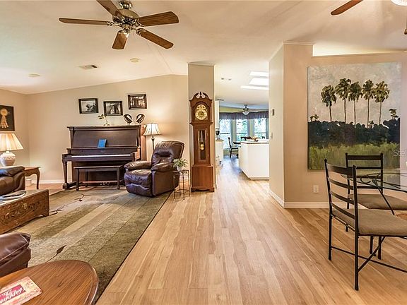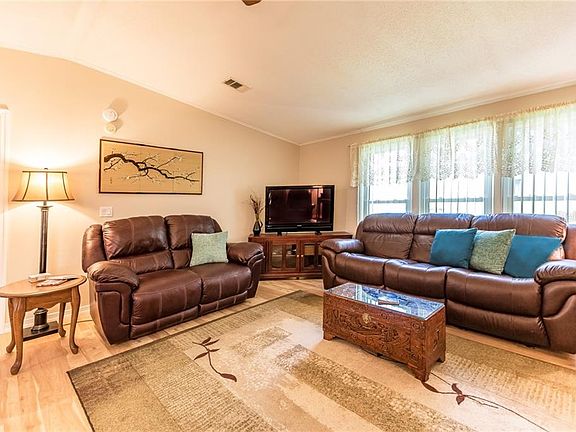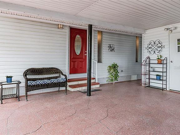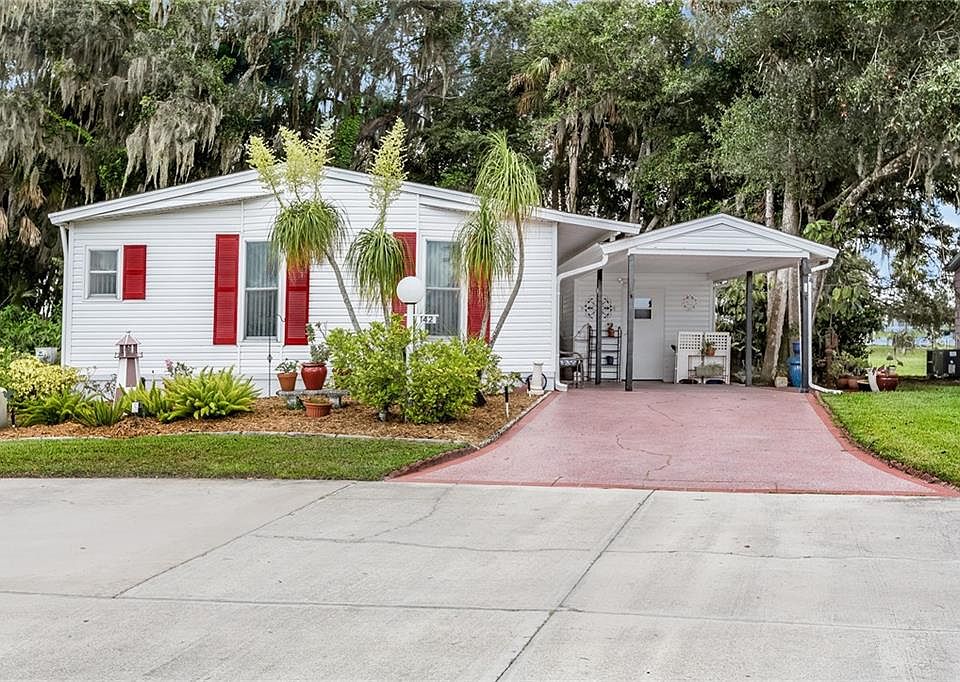 Located on one of the best land-owned lots in Ridgewood, is this unique, well loved 2 bed/2 bath home with oversized driveway and large workshop. As you step into the house through the new entryway door, you will immediately fall in love with the large living room with waterproof vinyl wood look floors and high ceiling. Home has split floor plan with Master bedroom and ensuite on one side and guest room and bathroom on other side. Large, well appointed kitchen has a custom island with built-in trash and full length drawers. NEW AC and Vapor Barrier, 13 hurricane impact windows, plywood subfloor, extra tie-downs, and sheetrock walls are some of the many upgrades and features this unit has to offer. Washer and dryer are located inside and are included with purchase. Murphy bed in second bedroom can be used for guests or stored away to make room for a hobby or office. Spacious lanai offers a pond view, private backyard, and unit that cools and heats the room. Ridgewood Meadows is an active 55+ community with pool, clubhouse, tennis courts, shuffleboard, fitness center, and library. Low HOA fees also cover 24-hr manned guard gate, irrigation, and lawn maintenance. Conveniently located near shopping, I-75, and restaurants. Come see all the FL lifestyle has to offer!