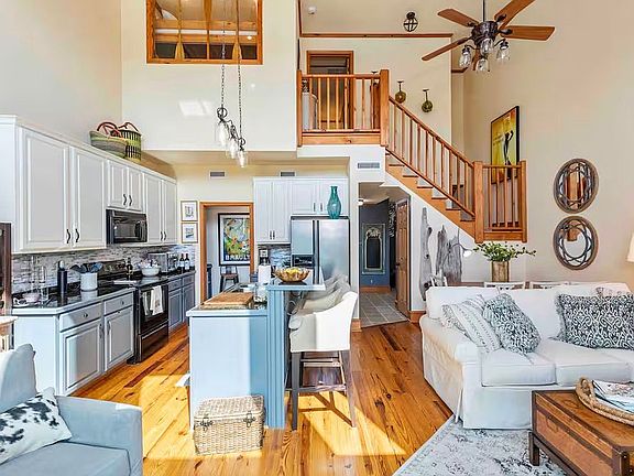 This is a beautiful get away. Right on the water. Beautiful views. Wood floors, This condo comes furnished. High ceilings lots of windows, great open floor plan with the great room and kitchen. Nice entry foyer leading into the great room. Large second bed room down stairs. Master bedroom upstairs. Lots of room, open window view from he master bed room overlooking the great room and view to the lake. Nice master bath. Large walk-in closet. Easy access to docks, boat launch and swimming.