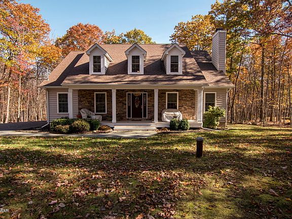 Stunning expanded Cape Cod, only 10 years new. Located in Pocono Mountain Woodland Lakes, close to I 84 and minutes to Milford. This 4 bedroom home boasts hardwood floors, open 2 story foyer, spacious living room with fireplace. Dining room flows into the large modern kitchen with custom cabinetry and granite counter-tops. Also a family room with deck off the back. Upstairs there is an amazing Master Bedroom with vaulted ceiling. His and her closets. Master bath has Jacuzzi and separate shower. Three additional nice sized bedrooms, full bath and plenty of closets. Walk out finished basement with utility room and 2 car garage. Foundation is superior wall construction. Easy to show.