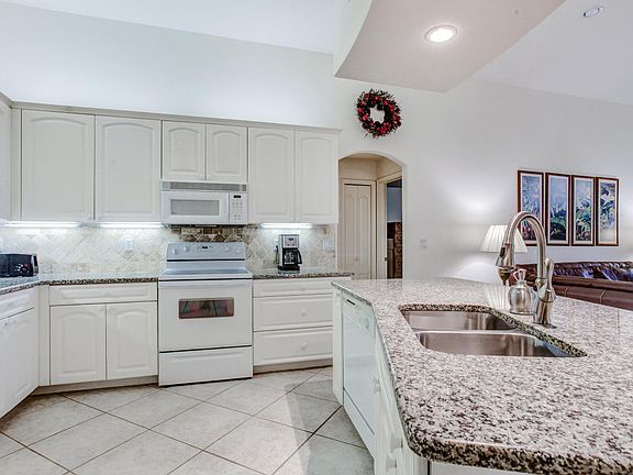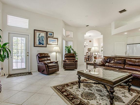 Built in 2000, this lovely home is impeccably maintained and offers 3 bedrooms and 2 baths. Pavered walk-ways around property give it a park-like setting where you can enjoy water and golf course views on your professionally landscaped yard that offers total privacy to enjoy the screened pool and covered lanai. Many upgraded features including a beautiful kitchen, energy-efficient with LED lighting, new A/Cs in 2014, tray and vaulted ceilings, circular driveway, central vacuum, epoxy garage floor, and so much more. The home has many picture windows & decorative architectural cut-outs. Kitchen has white cabinets with crown molding, under-mount lighting, granite counters and decorative tile back-splash, & a new refrigerator with freezer on the bottom. Enjoy eating at the large breakfast bar.