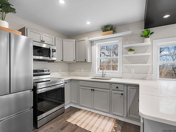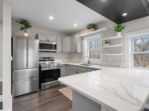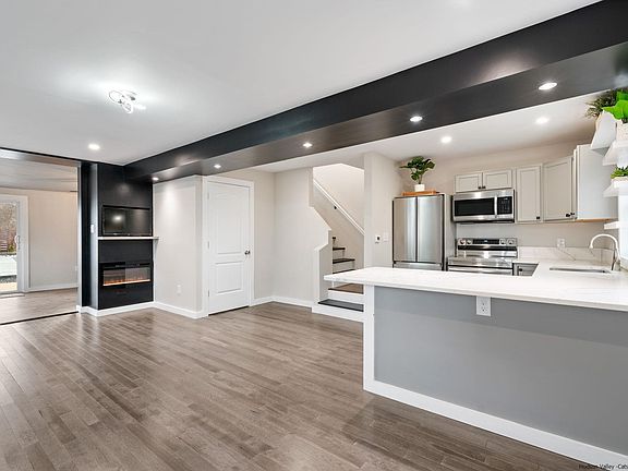 Introducing this beautiful renovated two bedroom, 1/1/2 bath home that blends modern comfort with classic charm. Nestled in on a dead end road, this home has undergone a comprehensive makeover, leading no detail untouched. As you approach , you will notice the brand new roof, a symbol of care that has gone into this home revival. Step inside and you will be greeted by an inviting living space that connects the dining area and kitchen. The open floor plan is perfect for entertaining friends and family. The kitchen has wooden cabinets and stainless steel appliance along with gleaming marble countertops. From the dining area you can walk into the living room with sliding doors onto the deck. Both dining room and living room have electric fireplaces to add warmth and ambiance. When you walk into the convenient down stairs half bath / laundry room combo you will find a stack-able washer and dryer. Go upstairs to your two bedrooms and beautiful full bath. Step outside to discover a partially fenced yard that has been thoughtfully landscaped. Enjoy summer evenings on the deck, perfect for barbecues and relaxation. A fire pit area adds an enchanting touch, creating the ideal setting for roasting marshmallows and sharing stories under the stars. One of the standout features of this property is the brand new one-car garage with an electric garage door. Its not just a place to park your vehicle, there is room for a work bench but also offers valuable storage space. This home is more than just a house, it's a place where memories are made and cherished. With its charming character its ready to welcome you into a new chapter of home ownership. Don't miss this opportunity to make this renovated gem your forever home.