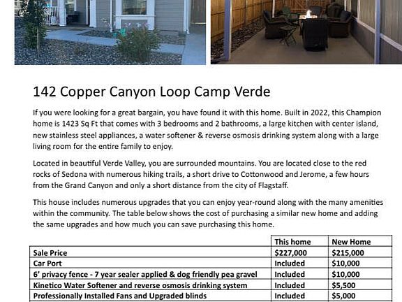 Are you looking for a great DEAL, you have found it with this practically new home. 2022 Champion home is 1423 Sq Ft is a 3 bedrooms and 2 baths ,large kitchen with center island, stainless steel appliances, a water softener & reverse osmosis drinking system along with a large living room for the entire family to enjoy. Fenced back yard and patio area Located in beautiful Verde Valley, you are surrounded mountains. Located close to the red rocks of Sedona with tons hiking trails, a short drive to Cottonwood and Jerome, a few hours from the Grand Canyon. This house includes numerous upgrades that you can enjoy year-round along with the many amenities within the community including year round pool, hot tub, pickleball courts, dog park and the many other amenities at the clubhouse