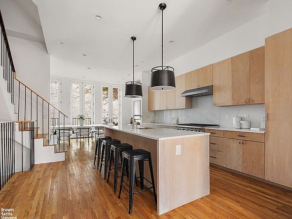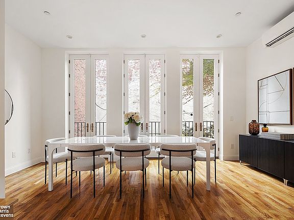 The parlor floor boasts a light-filled and airy living space with oversized windows that flows into a modern kitchen, equipped with top-of-the-line appliances including a Wolf range. The adjacent oversized dining room completes this open-plan level, offering the perfect space for entertaining.